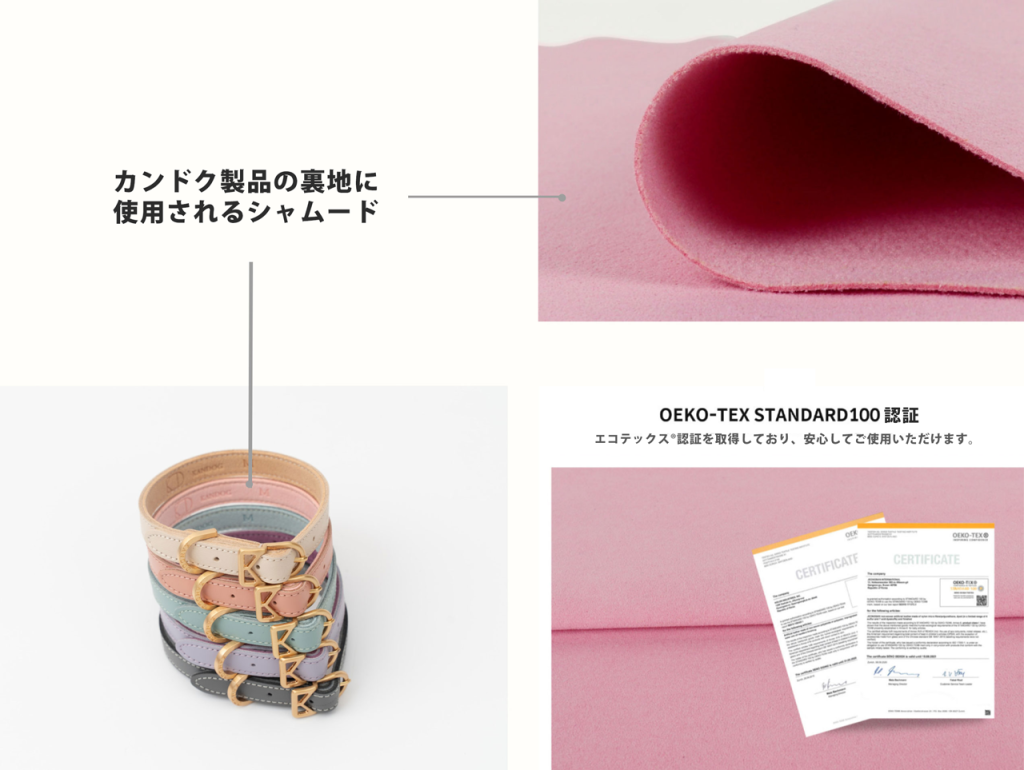 KANDOG製品の裏地には、ドイツの厳しいオコテスト(OKO TEST)を通過した特殊生地シャムードを使用しています。シャムードは、子供の体に触れる部分をより安全にし、製品との摩擦を最小限に抑えるために考案された、KANDOG独自の高級裏地です。